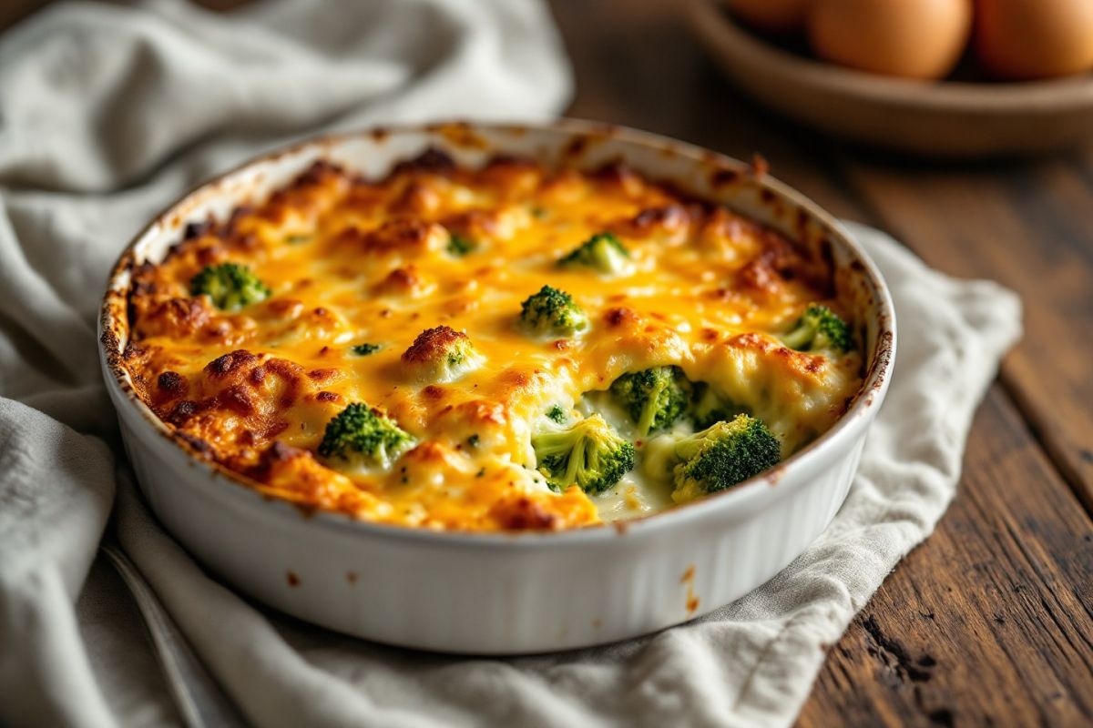 - Versez sur le brocoli et les fromages. Cuisez 35 minutes, à déguster tiède.