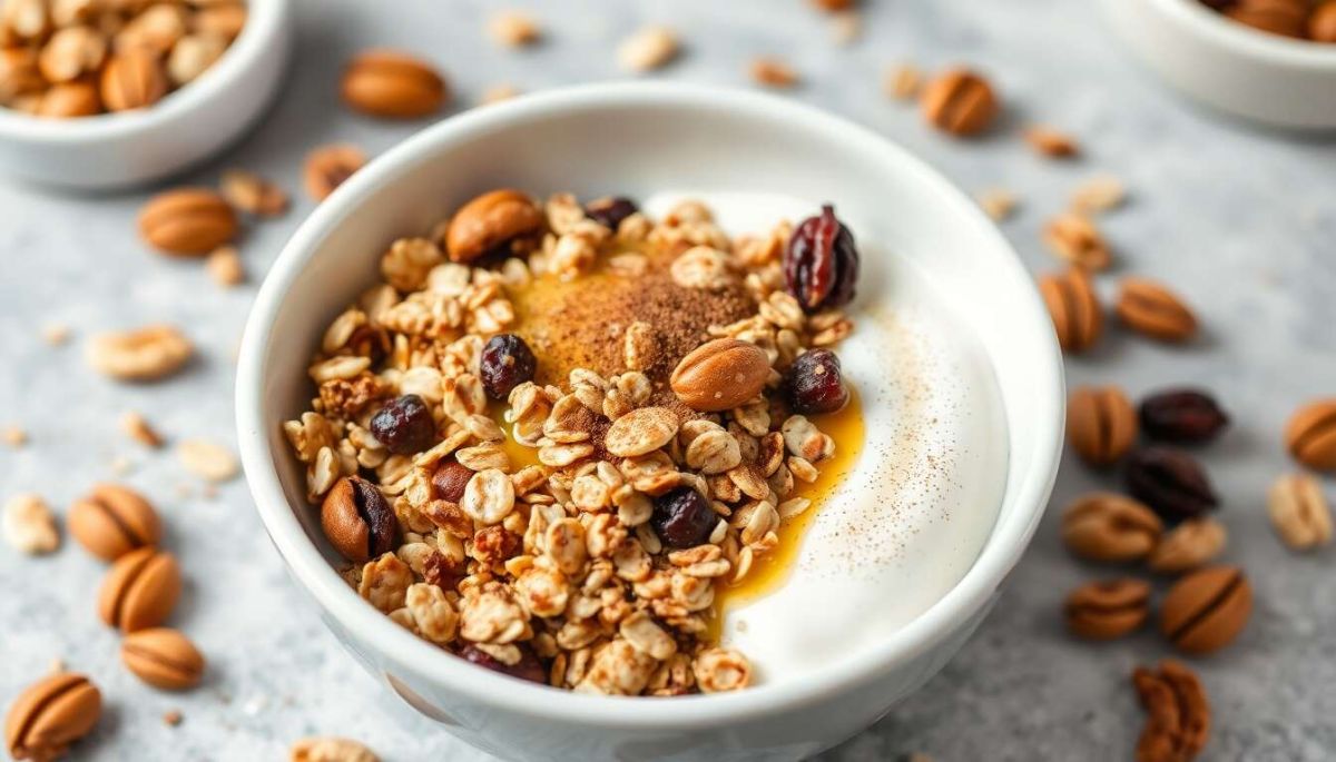 Dressez votre granola dans un joli bol avec du yaourt nature ou du fromage blanc, en y ajoutant des tranches de banane ou quelques baies pour une touche colorée et savoureuse.