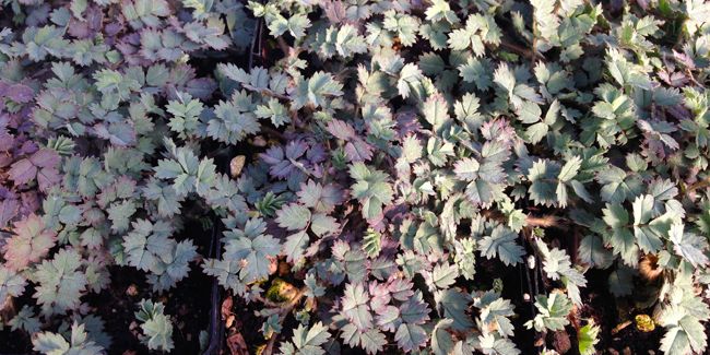 Les feuilles de cette variété mesurent environ 8 cm de long et présentent une teinte bleu-gris, ornée de nuances bronzées sur les bords, agrémentées de folioles arrondies. En juin et juillet, elle produit des inflorescences globuleuses violet foncé. Ces fleurs se transforment ensuite en akènes rouge foncé, décoratifs, mais à manipuler avec prudence car ils sont peu appréciés par nos amis à quatre pattes.