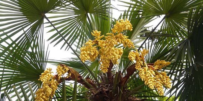 Le palmier chanvre se distingue par son tronc unique, long et non ramifié, surmonté d'un épais feuillage vert foncé. Ses feuilles, pouvant atteindre 80 cm de long, présentent un aspect découpé, ressemblant à un éventail. En mai, de petites fleurs jaunes apparaissent, suivies par la formation de petits fruits presque noirs, caractéristiques des espèces femelles.